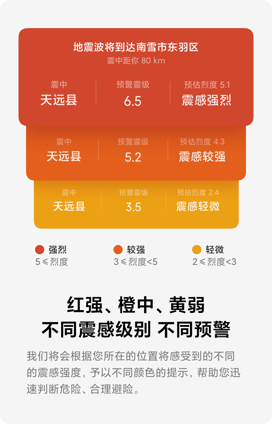 根据地震传播特点,随着您所在地区离震中距离的增加,地震的破坏性会逐渐降低。系统将根据地震震源中心位置、预测震级、预测震感等信息,向离震中不同距离的区域内的设备,发布不同震感级别的预警通知。为避免无效预警,震感较弱的地区不会收到预警。
